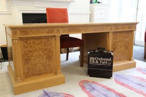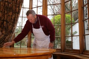 Expert French Polisher restoring an antique desk.